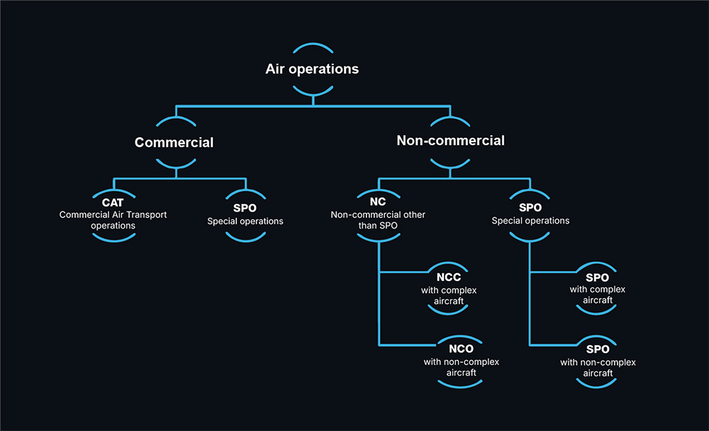 EASA defines four main operation types: CAT (Commercial Air Transport), NCC (Non-Commercial Complex), NCO (Non-Commercial Other-than-Complex), and SPO (Specialised Operations). Each applies to specific aircraft and activity categories. Business jet operators typically fall under CAT when performing charter services and under NCO or NCC when operating privately without passenger remuneration.